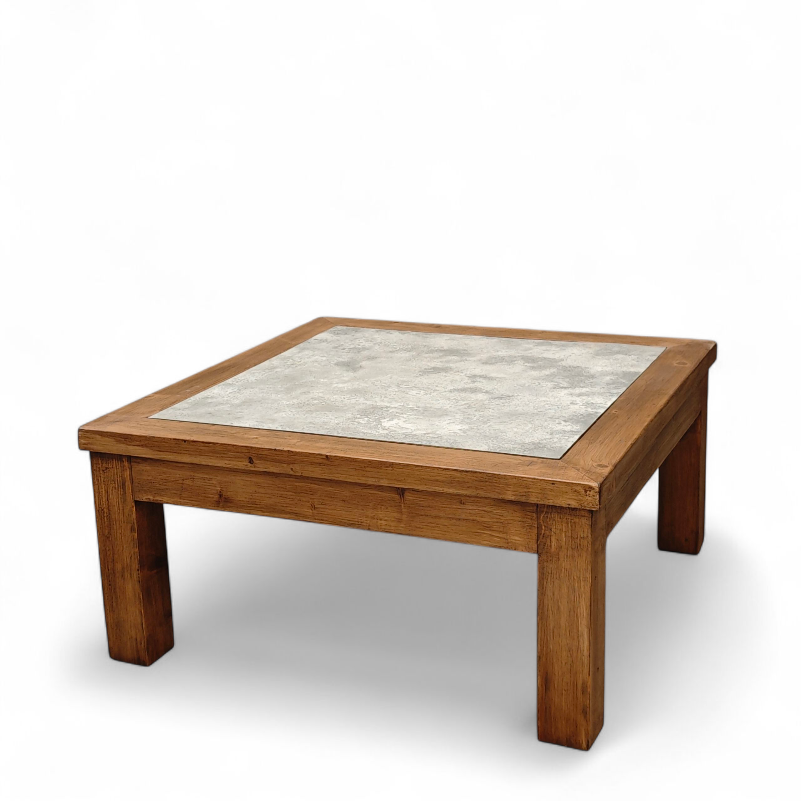Realizada en madera de pino con sobre enmarcado también en pino y centro de aluminio envejecido.